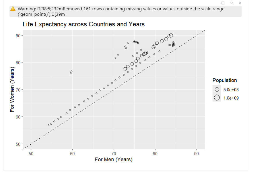 ##ggplot(life_expectancy_data, aes(x = LifeExpMale, y = LifeExpFemale, size = Population))+ ##geom_point(shape = 21, color = "black", fill = NA) + ##geom_abline(intercept = 0, slope = 1, linetype = "dashed") + ##labs(title = "Life Expectancy across Countries and Years", ##x = "For Men (Years)", ##y = "For Women (Years)") + ##scale_size_continuous(breaks = c(5e8, 1e9), ##labels = c("5.0e+08", "1.0e+09"), ##guide = guide_legend(override.aes = list(fill = NA, color = "black"))) + ##xlim(50, 90) + ##ylim(50, 90)