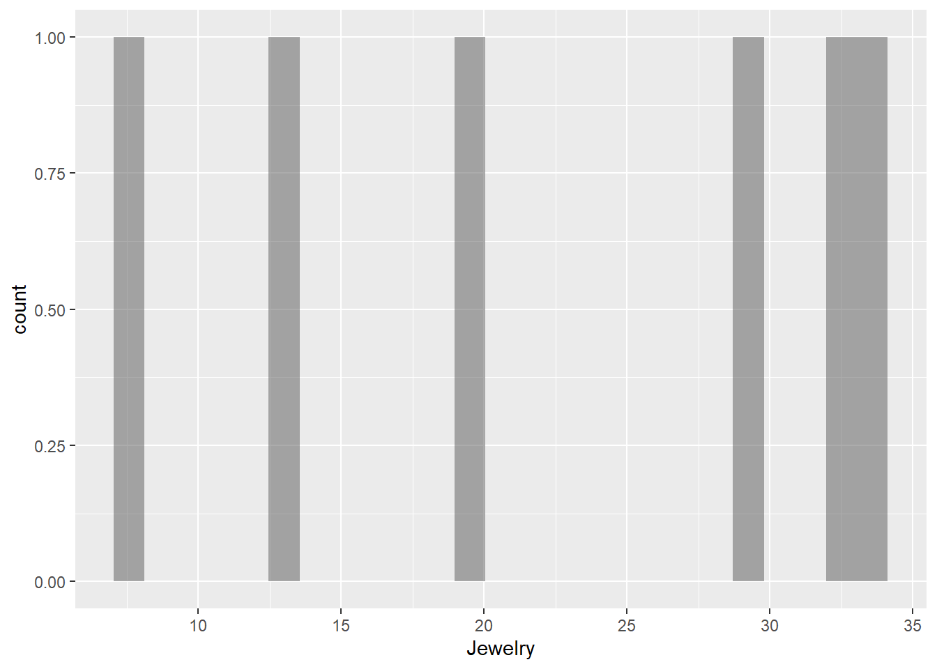 gf_histogram(~Jewelry, data = gifts_age)