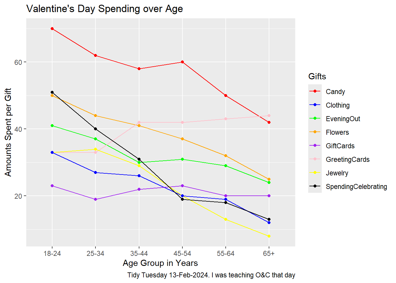 gf_line(AmountsSpent ~ Age, data = gifts, group =~ Gifts, color =~ Gifts) %>%gf_point() %>%gf_labs(title ="Valentine's Day Spending over Age",x ="Age Group in Years",y ="Amounts Spent per Gift",caption ="Tidy Tuesday 13-Feb-2024. I was teaching O&C that day" ) %>%gf_refine(scale_color_manual(values =c("Candy"="red", "Clothing"="blue", "EveningOut"="green", "Flowers"="orange", "GiftCards"="purple", "GreetingCards"="pink", "Jewelry"="yellow", "SpendingCelebrating"="black")))
