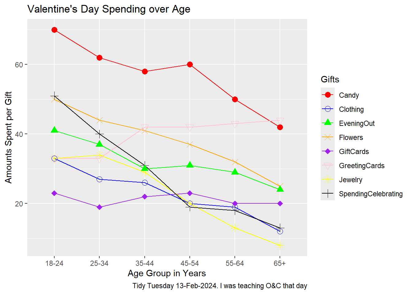 gf_line(AmountsSpent ~ Age, data = gifts, group =~ Gifts, color =~ Gifts) %>%gf_point(shape =~ Gifts, size =3) %>%# Use shape directlygf_labs(title ="Valentine's Day Spending over Age",x ="Age Group in Years",y ="Amounts Spent per Gift",caption ="Tidy Tuesday 13-Feb-2024. I was teaching O&C that day" ) %>%gf_refine(scale_color_manual(values =c("Candy"="red", "Clothing"="blue", "EveningOut"="green", "Flowers"="orange", "GiftCards"="purple", "GreetingCards"="pink", "Jewelry"="yellow", "SpendingCelebrating"="black"))) %>%gf_refine(scale_shape_manual(values =c("Candy"=16, "Clothing"=1, "EveningOut"=17, "Flowers"=4, "GiftCards"=18, "GreetingCards"=25, "Jewelry"=8, "SpendingCelebrating"=3)))