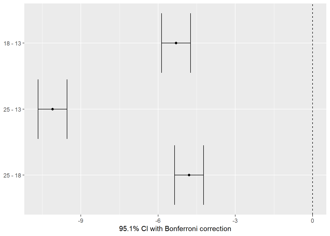 the black points are the difference in the means of the hatching time. yaxis the groups pairwise xaxis difference in means of the groups the lines are the confidence intervals pairwise