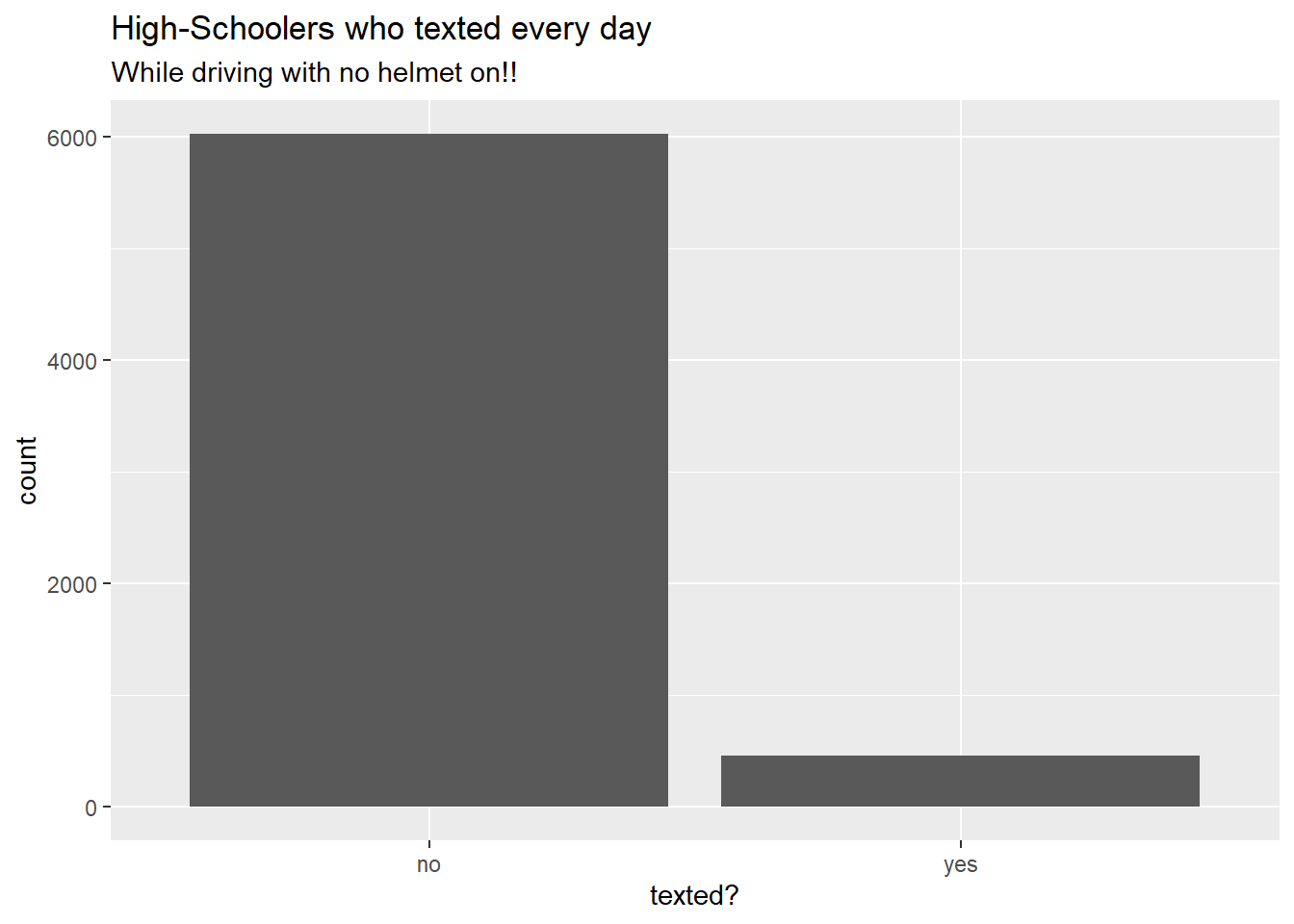 no_helmet_text %>%drop_na() %>%gf_bar(~text_ind) %>%gf_labs(x ="texted?",title ="High-Schoolers who texted every day",subtitle ="While driving with no helmet on!!" )